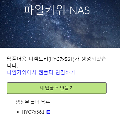 NAS장비 내에 디렉토리가 하나 생성되고, 파일키위 서비스와 연결할 준비가 끝난 상태가 됩니다.