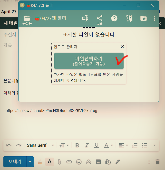 반면, 파일키위는 업로드전에 다운로드 링크가 생성됩니다. 일단 바로 전달이 가능합니다.
