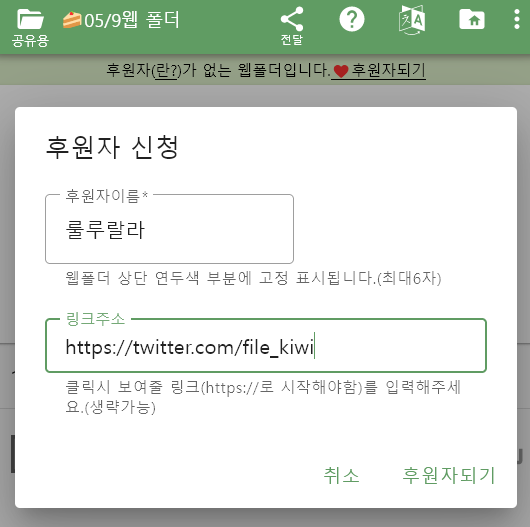 이 기능을 사용하면, 상대방이 비용을 고민하지 않도록 만들 수 있습니다. 또는 다운로드 할 수 있도록 다른 분에게 도와달라고 요청할수도 있습니다. 사장님이 후원자가 될 수도 있고, 웹폴더를 공유하는 커뮤니티에 속한 누군가가 후원해 줄수도 있습니다.